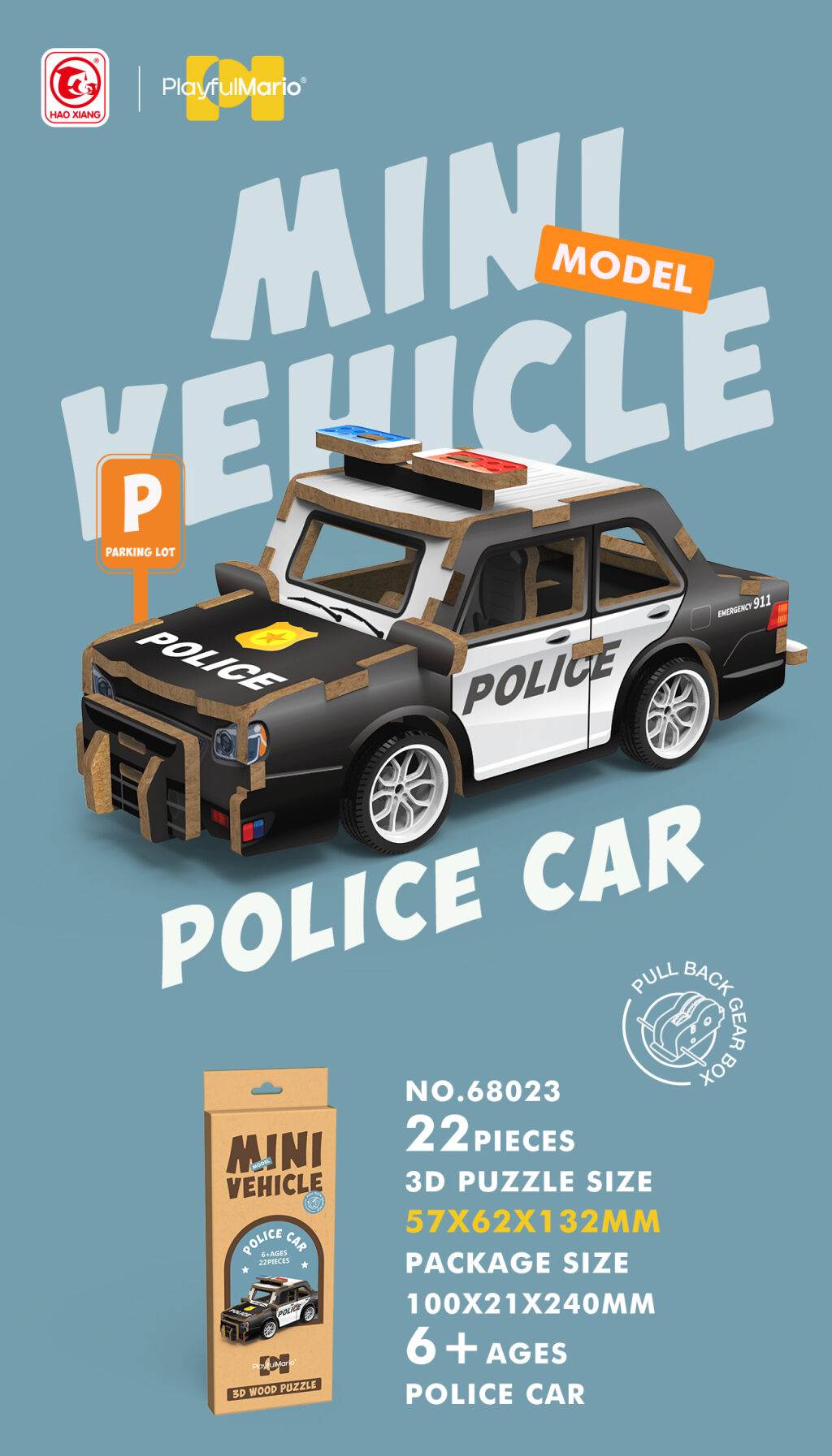 3D puzzle dřevěné - Policejní auto. Rozměry 13x6,2x5,7 cm. 22 dílků. Na zpětné natažení.Parametry produktu