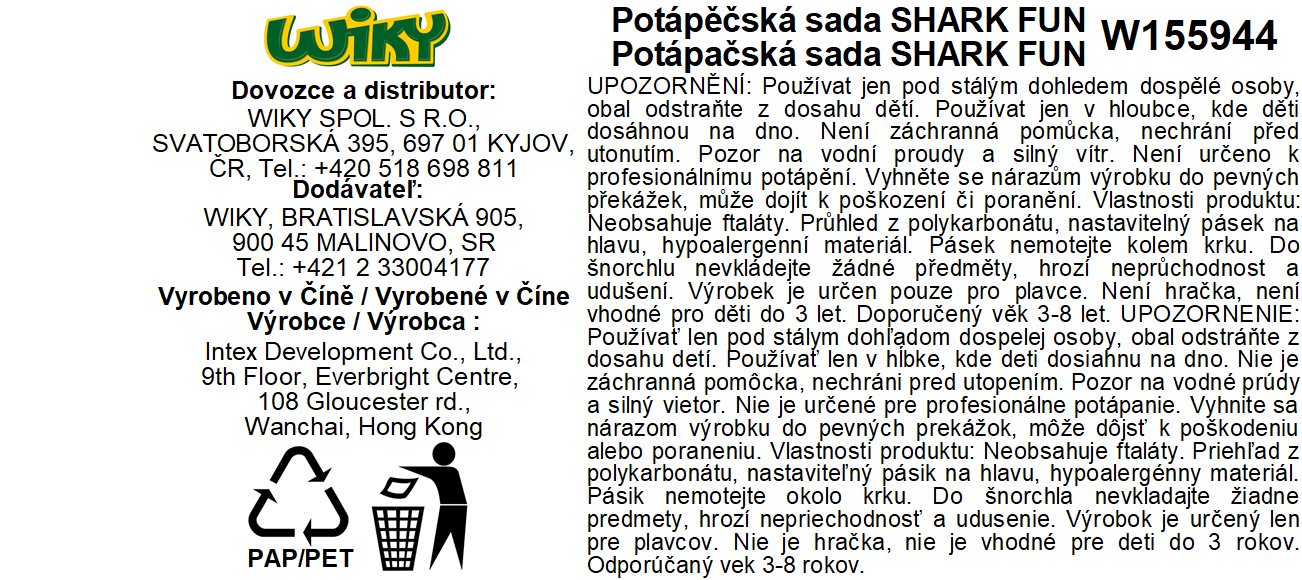 Dětský potápěčský set Shark. Balení obsahuje šnorchl a brýle.Parametry produktu