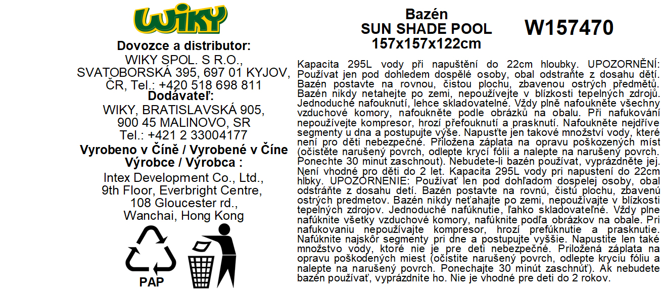 Dětský bazén se střechou, velikost: 157 x 157 x 122 cm, objem: 295 l, výška hladiny: 22 cm, odnímatelná nafukovací stříška, vinyl 0,25 mm, vypouštěcí ventil, opravná sadaParametry produktu