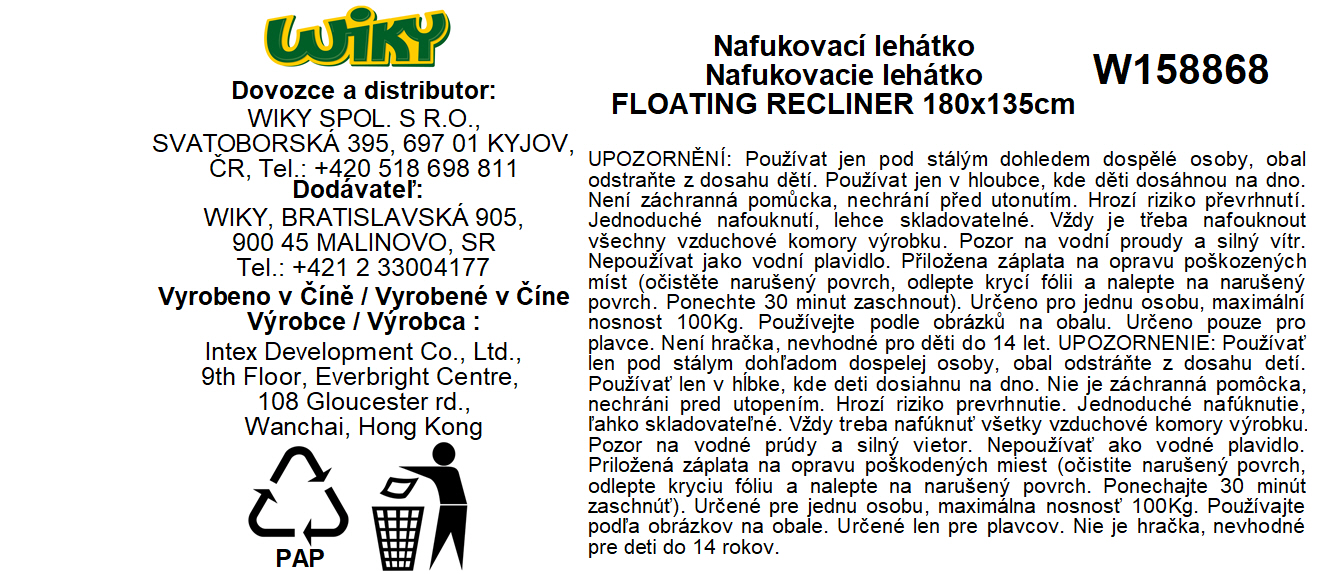 Velmi pohodlné nafukovací lehátko v bílo-modrém provedení. Velikost lehátka je 180 × 135 cm. Skládá ze dvou vzduchových komor a součástí jsou dva držáky na pití a držadla pro větší komfort. Dvoukomorové nafukovací lehátko značky Intex. Tvar je uzpůsoben pro maximální pohodlí ve vodě. Součástí jsou dva držáky na pití a také dvě držadla. V balení je opravná záplata. Rozměry: délka 180 cm, šířka 135 cm. Materiál: kvalitní 0,45 mm vinyl.Parametry produktu
