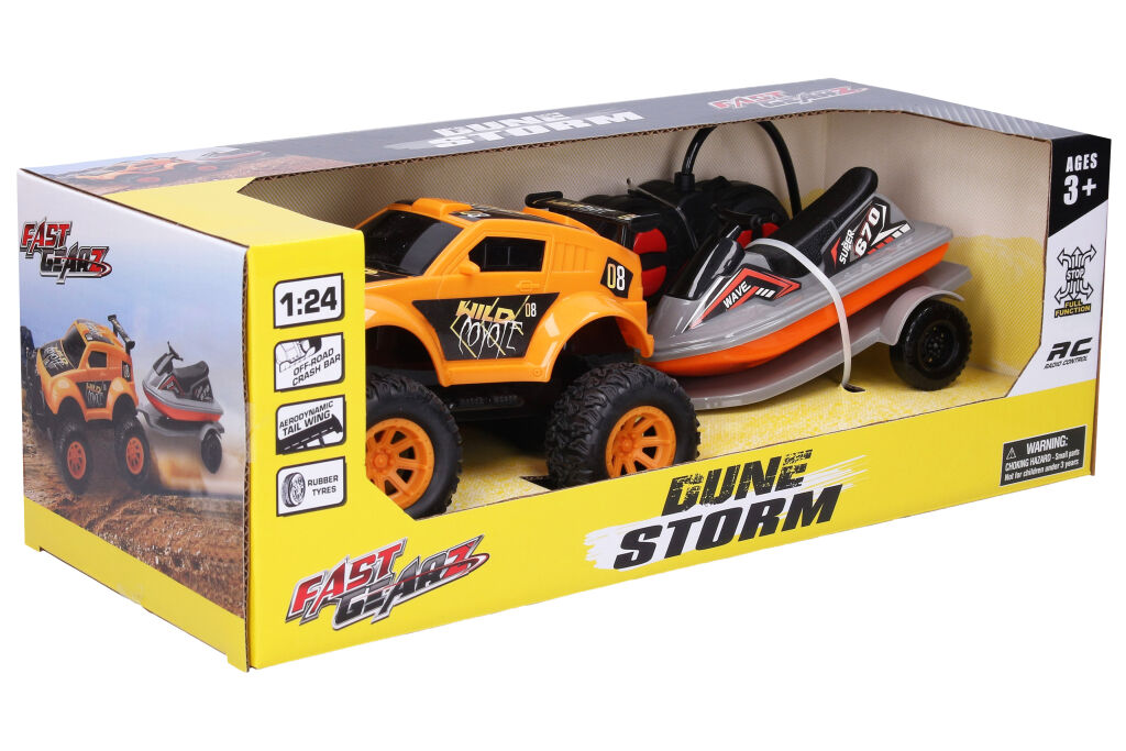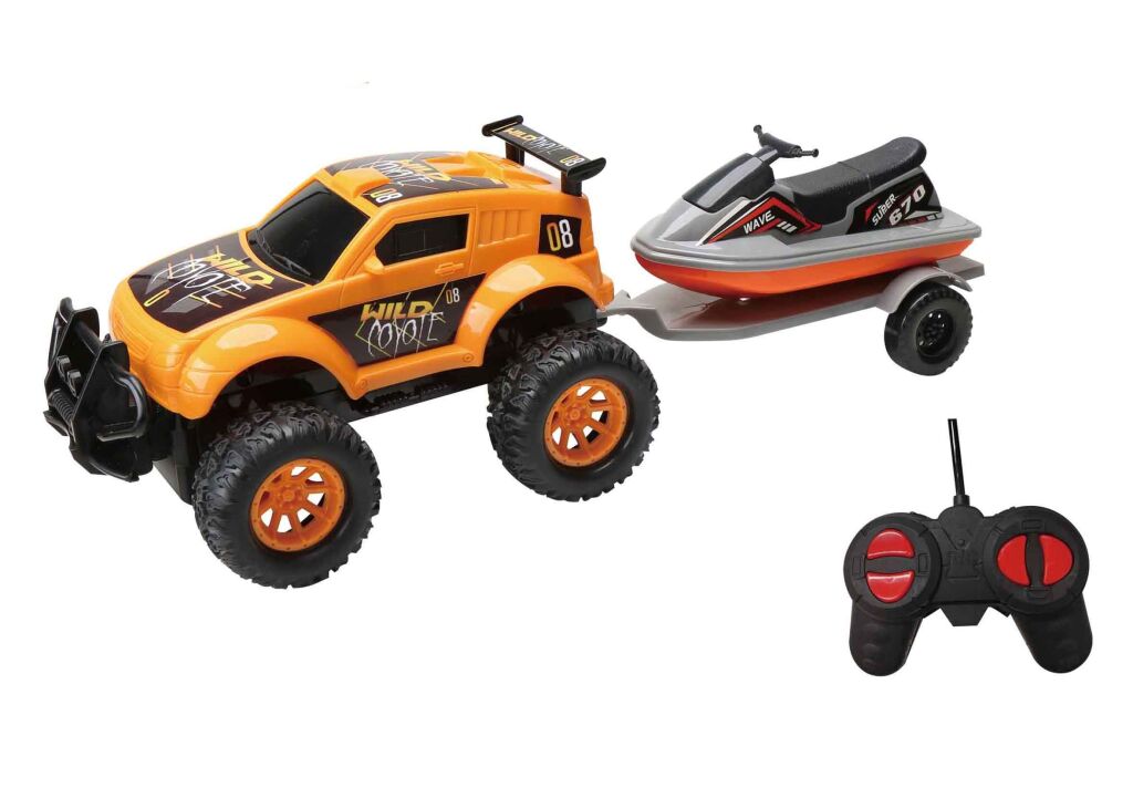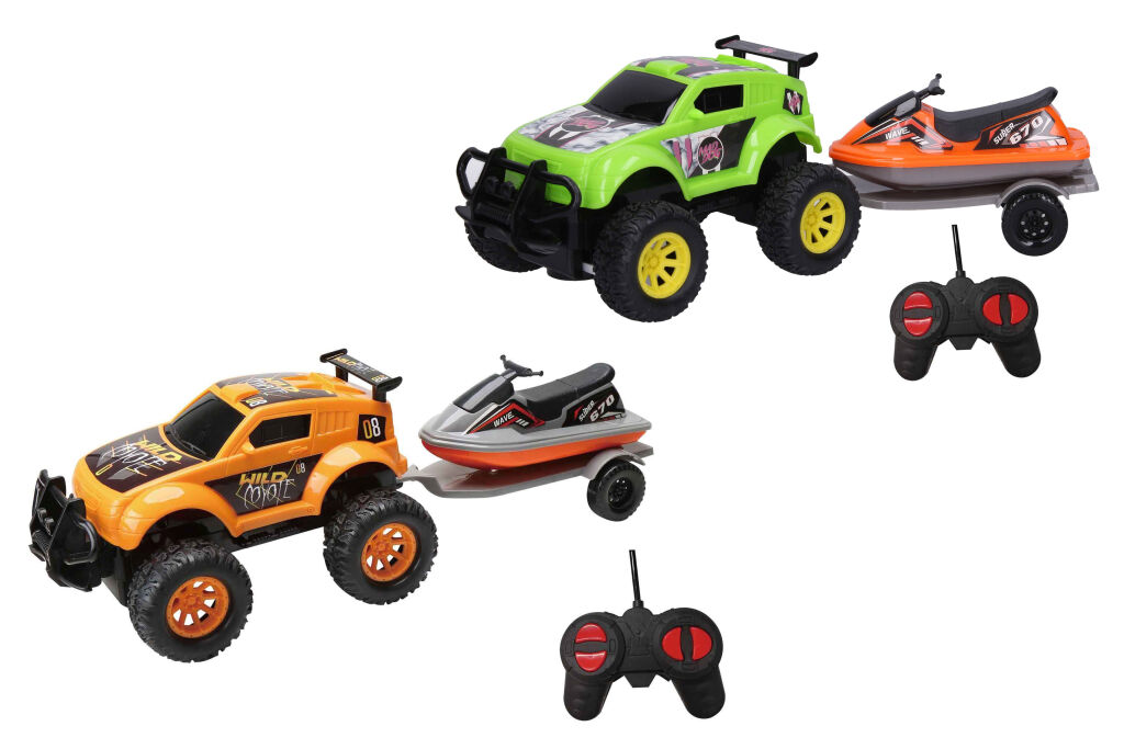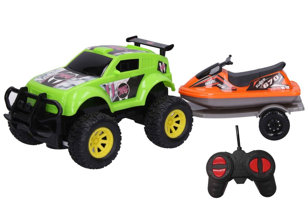 Auto terénní RC na dálkové ovládání s vodním skútrem na návěsu. Frekvence 27Mhz. Baterie - 3xAA auto, 2xAA ovladač, nejsou součástí balení. 2 varianty - zelená, oranžová.