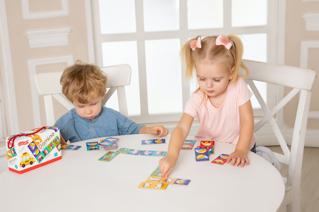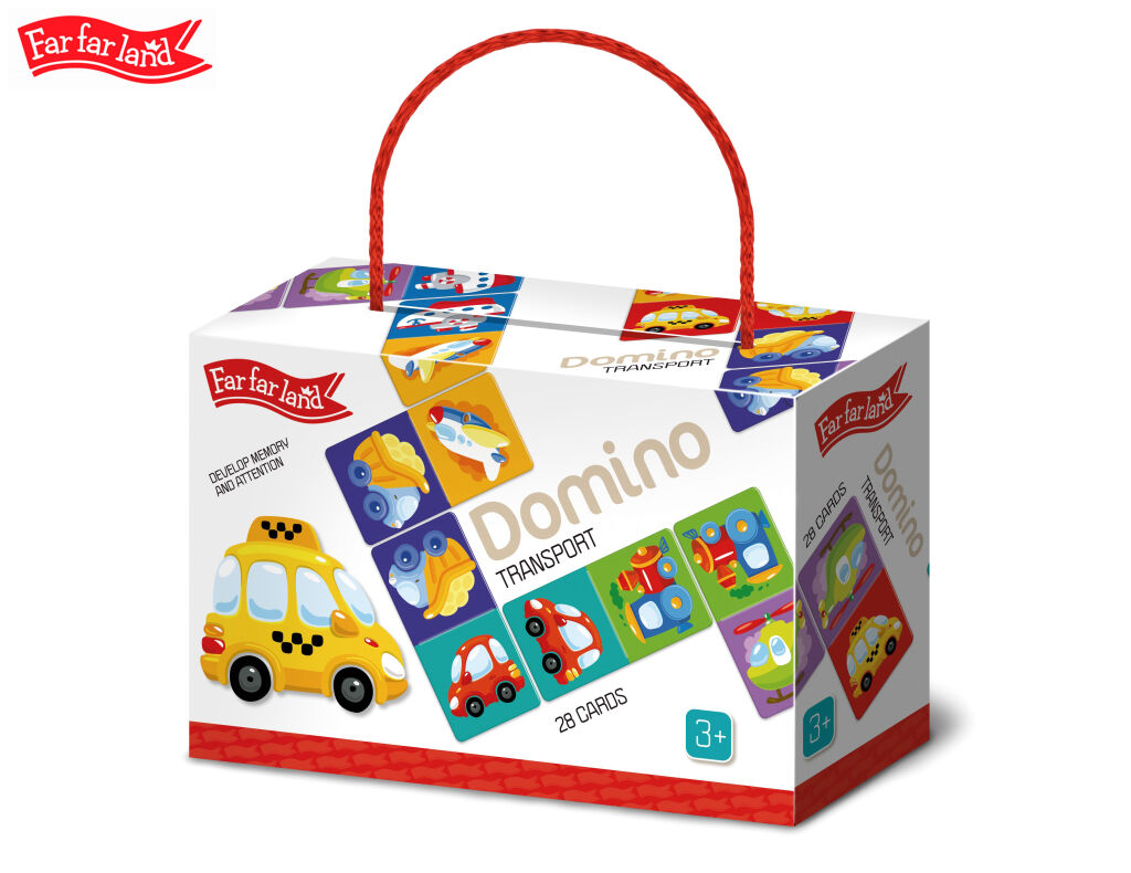 Far Far Land Domino s obrázky doprava. Balení obsahuje 28 karet. Hra pro 2-5 hráčů. Při hře 2 hráčů každý hráč dostane 7 karet. Při hře více hráčů každý dostane 5 karet. Zbývající karty jsou v "banku.“ Hráč, který má "dvojitou" kartu (kartu s totožnými obrázky), hraje první. Pokud žádný z hráčů nemá dvojitou kartu, každý hráč si vezme jednu kartu z banku. Pokud má více hráčů dvojitou kartu, začíná ten mladší. Pro rozehrání prvního tahu si však můžete vymyslet svá vlastní pravidla. Hráči se střídají a jeden za druhým přikládají karty ze své ruky ke kartám na hrací ploše se shodným obrázkem. Pokud hráč nemá shodný obrázek, musí si vzít kartu z banku. Hráč, který položí svou poslední kartu na hrací plochu, vyhrává. Pokud všichni hráči mají v ruce karty, ale není možné hrát dál, hra je ukončena "blokem" a vyhrává hráč, který má v ruce nejmenší množství karet.Parametry produktu