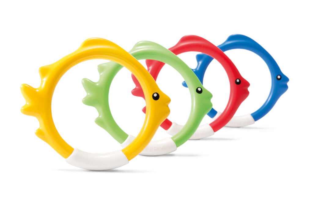 Sada čtyř barevných kroužků (modrá, červená, zelená a žlutá) pro potápění. Kroužek v designu ryby se po vhození do vody postaví na dno. ...