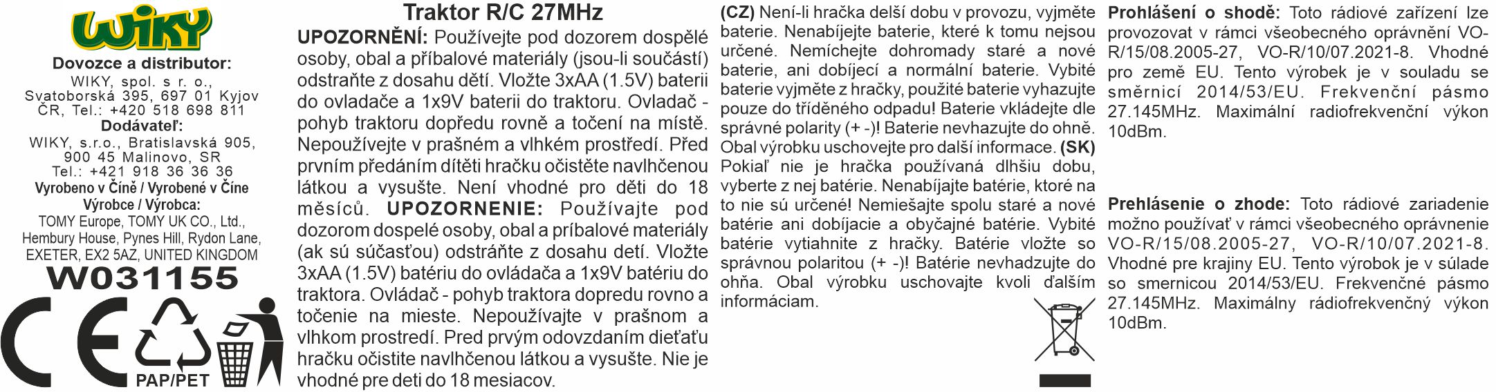 | Typ a počet baterií: | Ovladač - 3xAA (LR6) baterie není součástí, Traktor - 1x9V (6lr61) není součástí |