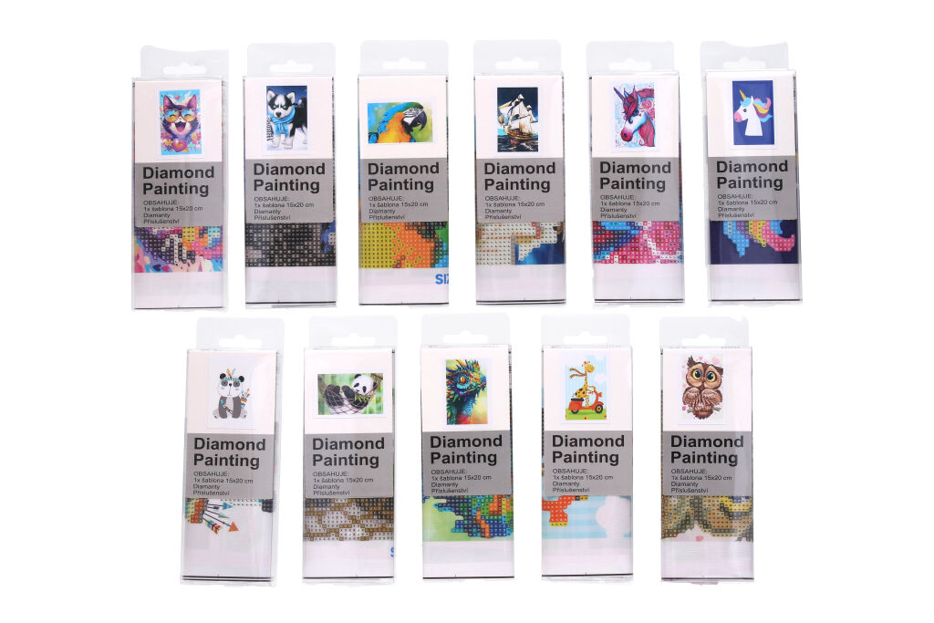Kreativita diamond painting o velikosti 15x20 cm Mix motivů. Obsahuje: šablonu, diamanty + příslušenství. 12 různých motivů.Parametry produktu