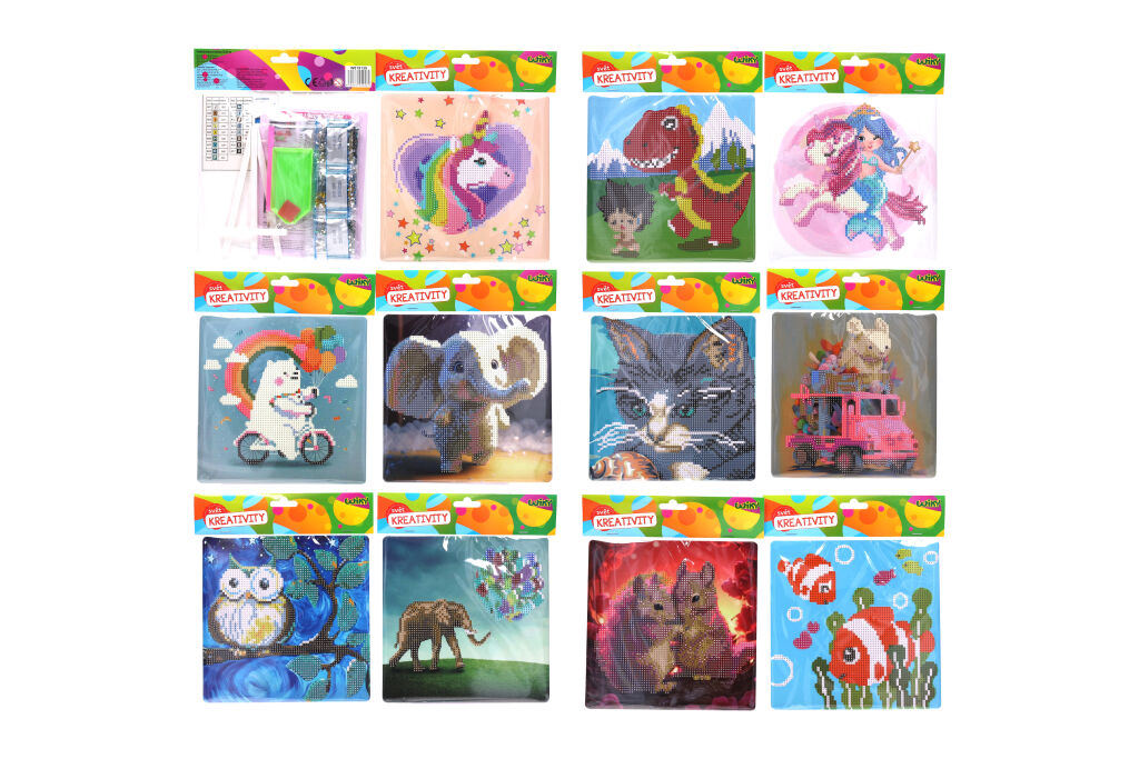 Kreativita diamond painting o velikosti 20x20 cm Mix motivů. Obsahuje: šablonu, diamanty + příslušenství + stojánek 12 různých motivů.Parametry produktu