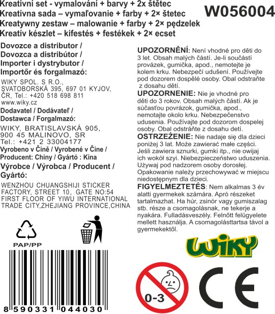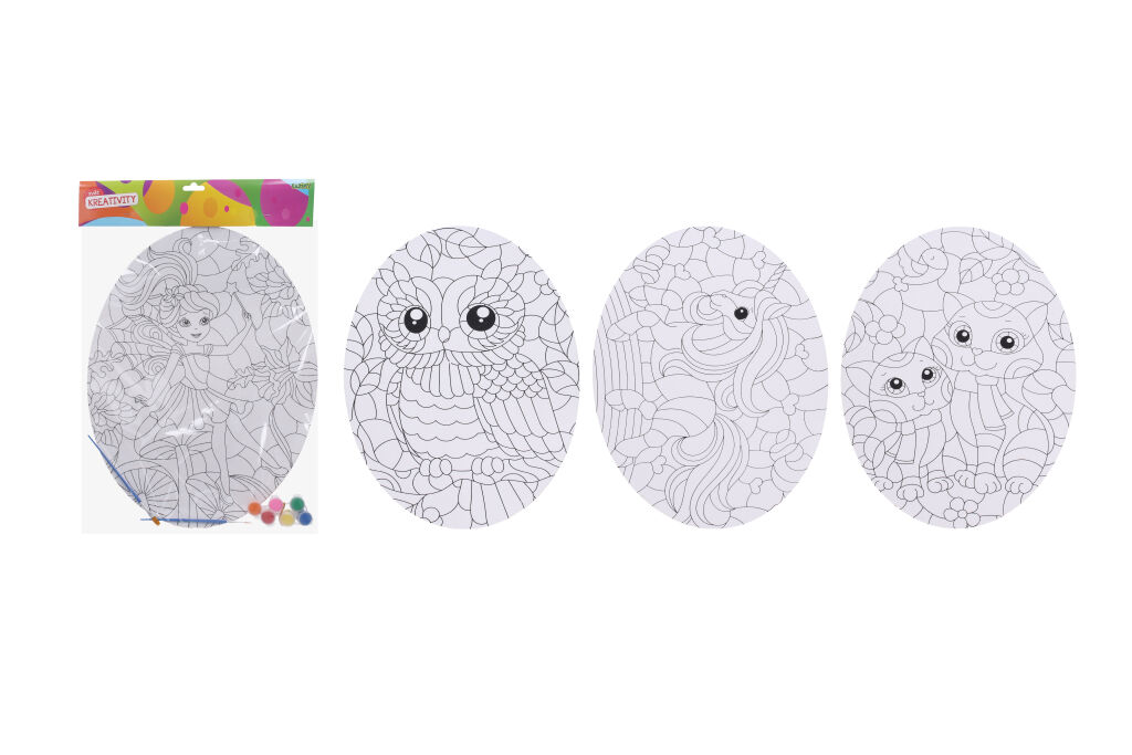 Kreativní set - vymalování ovál. Balení obsahuje: 1x barvy a 2x štetec. 4 varianty obrázků: víla, sova, kůň a kočky.