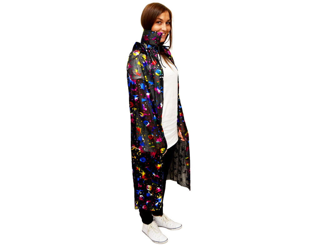 Plášť ideální pro malou čarodějku nebo čaroděje. Je vyroben z lesklého materiálu s potiskem barevných dýní. Plášť má límec a vázání na šňůrku u krku. Délka pláště: 120cm