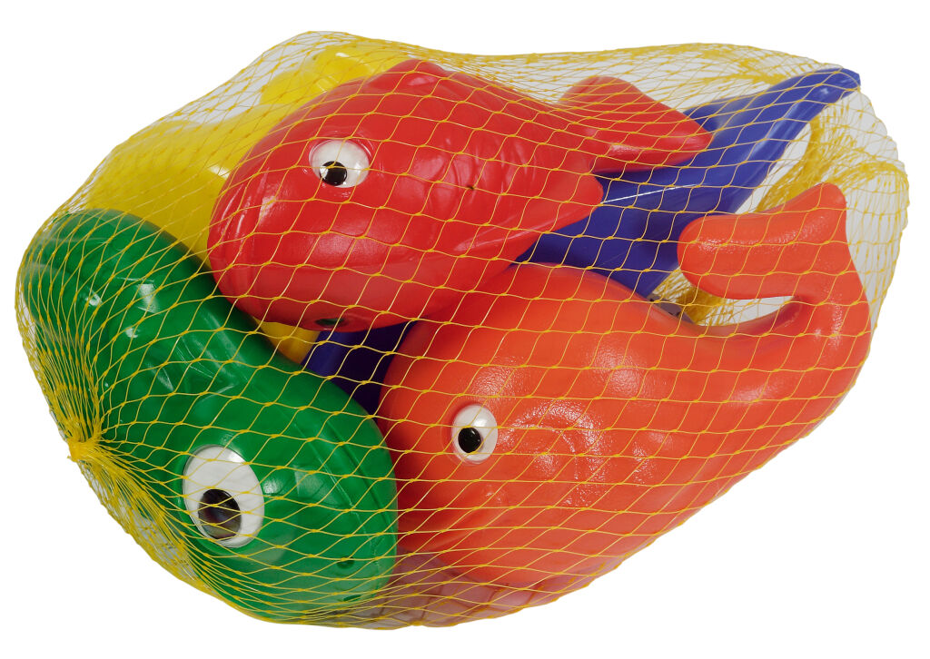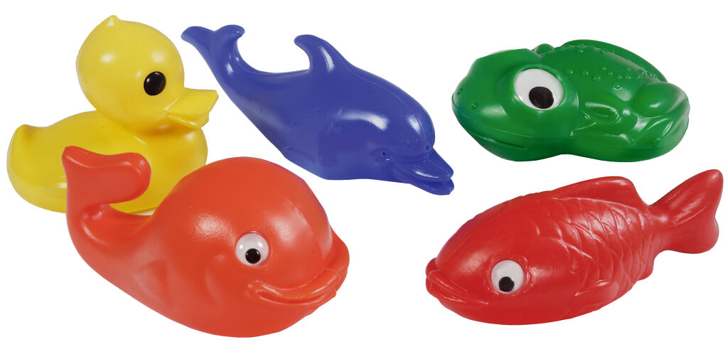 Zvířata do vody v síťce, 5 ks. Sada plastových hraček do vody pro nejmenší. Obsahuje: dvě ryby, delfína, žábu a kačenku. Doporučený věk: od 1 roku.