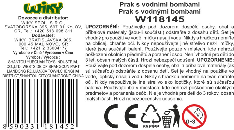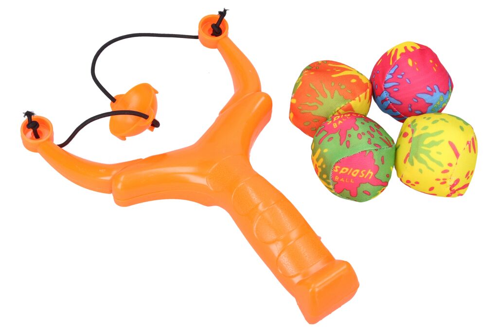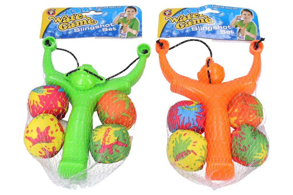 Prak s vodními bombami. Velikost praku 21 cm. Obsahuje prak, 4 vodní bomby. 2 varianty - zelená, oranžová.