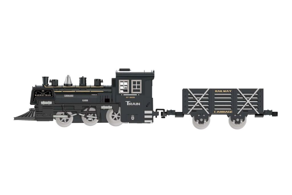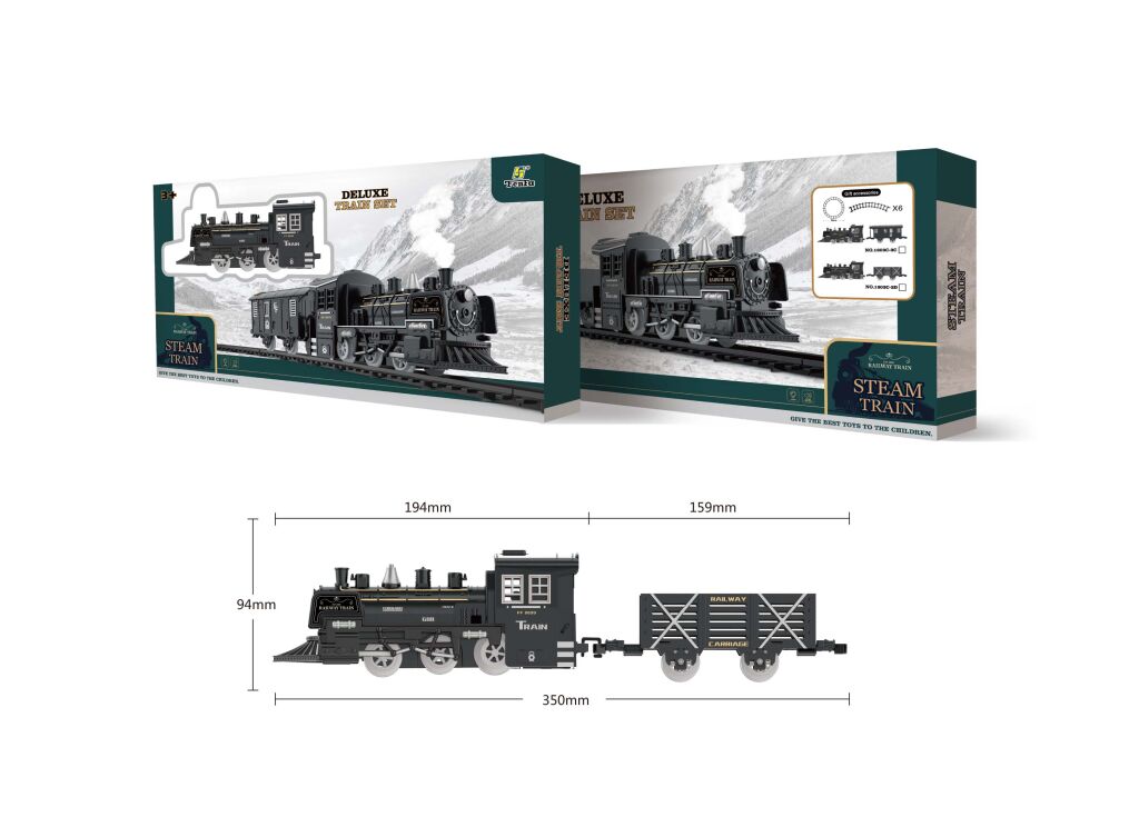 Vlak set. Rozměry železnice 75x75 cm, velikost mašinky 19,5 cm, vagónu 15,5 cm. Světelné, zvukové a kouřové efekty. 4xAA baterie do mašinky nejsou součástí. Přepínač ON/OFF na levé straně mašinky. Součástí mašinka, 1 vagón, 6 zahnutých kolejnic, nádobka na vodu. Nádržka na vodu pod stříbrným komínkem.Parametry produktu