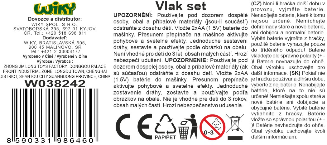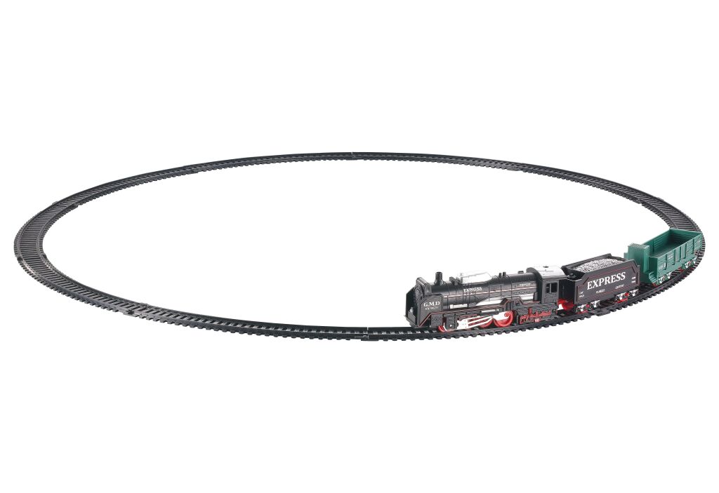 Vlak set. Rozměry železnice 68x68 cm, velikost mašinky 13 cm, vagónů 9-11 cm. Součástí mašinka, 2 vagóny. Světelné efekty. 2xAA baterie nejsou součástí. Přepínač ON/OFF na pravé straně mašinky.Parametry produktu